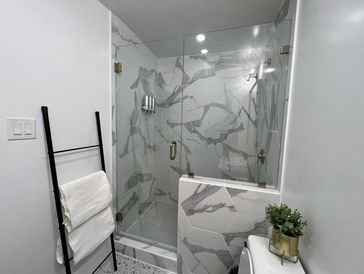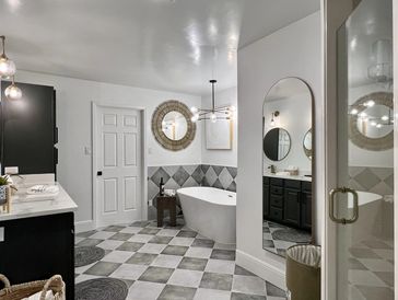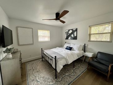 Primary suite offers a king size bed, walk-in closet, 50" TV and huge ensuite with modern soaker tub, shower and plenty of storage.
